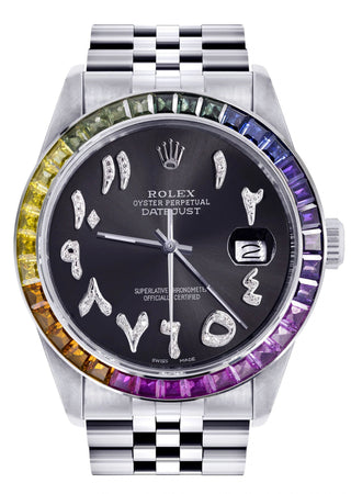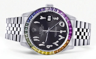 Diamond Gold Rolex Watch For Men 16200 | 36Mm | Rainbow Sapphire Bezel | Black Graphite Arabic Numeral Dial | Jubilee Band